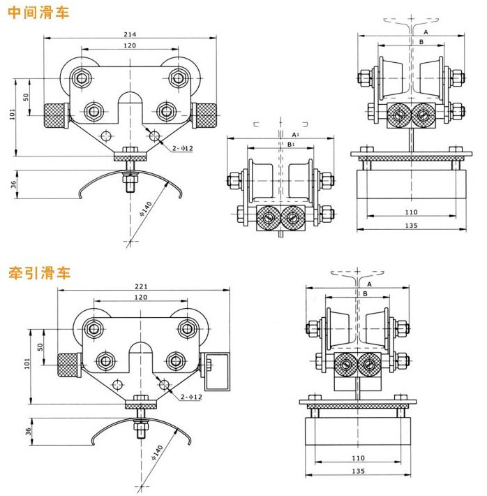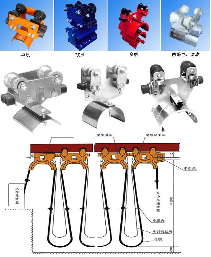 GHC系列工字鋼電纜滑車分為中載荷型、重載荷型、和輕載荷型,因此滑車走輪為Ф80、Ф63、Ф50的三種,承載能力≤50~150kg,每類按托板層數分為單層、雙層、三層,每類中有三種形式,首端為電纜牽引車,終端為固定掛線架,中間為電纜滑車。