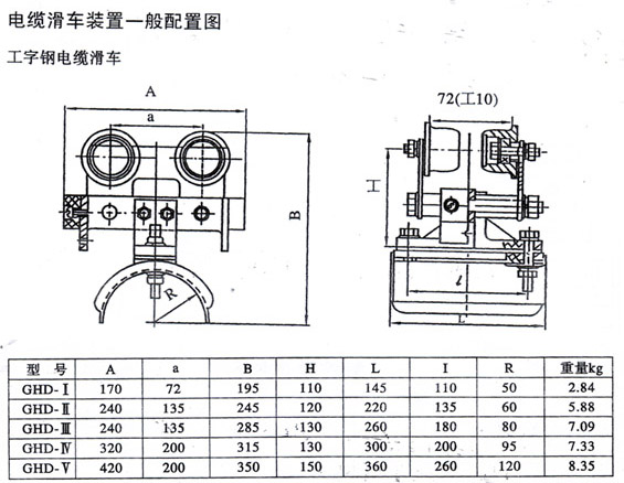 用于移動供電機械在移動中電纜的懸吊與移動,已廣泛應用于各類起重機械中。工字鋼電纜滑車該裝置具有結構堅固。移動靈活。安全可靠等優點。滑車由牽收引滑車、電纜滑車、終端滑車三部分組成,牽引滑車跟隨移動機械導纜(牽引)裝置,每個移動機械配1個,隨移動機械往返運行。中間電纜滑車將電纜懸掛在工字鋼軌道范圍內隨牽引滑車移動,兩端并裝有緩沖撞頭,滑車視移動長度不同而定數量。終端滑車固定在工字鋼導軌末端,一般每個移動機械設置1個。工字鋼電纜滑車該系列滑車分Ⅰ、Ⅱ、Ⅲ、Ⅳ、Ⅴ五種型號,如用戶采用12#、14#、16#或更大號數工字鋼,可在訂貨時注明,本廠可成套供貨。