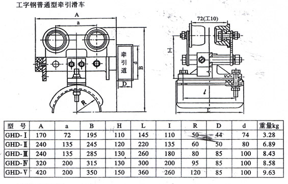 GHD-II型工字鋼電纜滑車用于移動(dòng)供電機(jī)械在移動(dòng)中電纜的懸吊與移動(dòng),已廣泛應(yīng)用于各類起重機(jī)械中。工字鋼電纜滑車該裝置具有結(jié)構(gòu)堅(jiān)固。移動(dòng)靈活。安全可靠等優(yōu)點(diǎn)滑車由牽收引滑車、電纜滑車、終端滑車三部分組成,牽引滑車跟隨移動(dòng)機(jī)械導(dǎo)纜(牽引)裝置,每個(gè)移動(dòng)機(jī)械配1個(gè),隨移動(dòng)機(jī)械往返運(yùn)行。中間電纜滑車將電纜懸掛在工字鋼軌道范圍內(nèi)隨牽引滑車移動(dòng),兩端并裝有緩沖撞頭,滑車視移動(dòng)長(zhǎng)度不同而定數(shù)量。終端滑車固定在工字鋼導(dǎo)軌末端,一般每個(gè)移動(dòng)機(jī)械設(shè)置1個(gè)。工字鋼電纜滑車該系列滑車分Ⅰ、Ⅱ、Ⅲ、Ⅳ、Ⅴ五種型號(hào),如用戶采用12#、14#、16#或更大號(hào)數(shù)工字鋼,可在訂貨時(shí)注明,本廠可成套供貨。